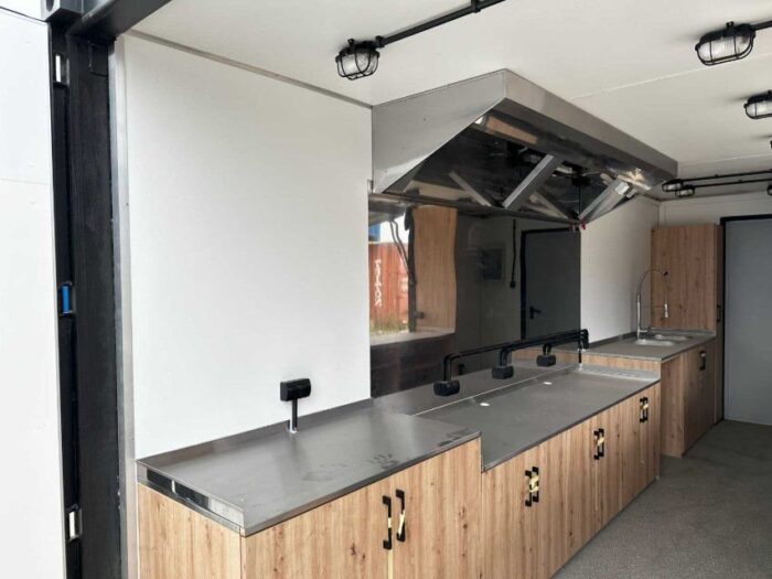 Il container rispetta lo standard marino originale con porte robuste e costruzione a secco. La versione High Cube con 2,59 m di altezza interna crea una piacevole sensazione di spazio e permette l’installazione di attrezzature professionali per la ristorazione.